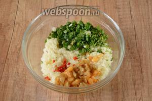 Петрушку, зелену цибулю і гострий перець подрібнити.
