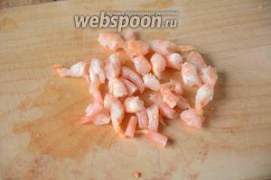 Креветки очистити від панцира, порізати на кілька частин.