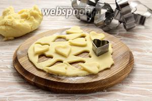 Печиво «Тануть моменти» часто відсаджують кондитерським мішком у вигляді спіральних пірамідок. Але з тестом приємно працювати вручну — ліпити фігурки довільної конфігурації або вирізати шаблонами. Я вирішила присвятити свої «моменти» «тане сердець».