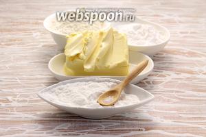 Беремо кукурудзяний крохмаль, ванільний цукор, цукрову пудру, пшеничне борошно і вершкове масло.