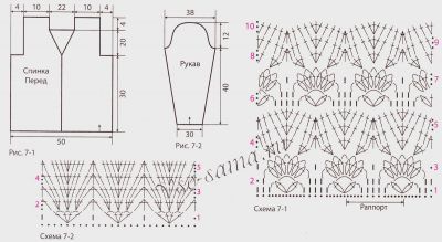 Розміри і напрямок в’язання вказані на схемі (рис. 7-1, рис. 7-2).