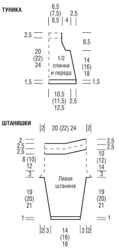 Петлі правої і лівої штанини перевести на кругові спиці і відзначити середину колош. Між штанинами набрати на спиці по 8 п. для клина і продовжити в’язати на всіх петлях круговими рядами лицьовою гладдю = 100 (108) 116 п. В кожному 2-му коло.р. виконати 4 убавки клина, як описано вище = 84 (92) 100 п. Для бічних убавок зменшити в середині штанин в кожному 12 (14) 16-му коло.р. 2 рази по 1 п. = 80 (88) 96 п. Через 11 (13) 15 см від початку крокової лінії продовжити в’язати укороченими рядами. Для цього 40 (44) 48 п. передньої деталі штанців тимчасово залишити і на 40 (44) 48 п. спинки продовжити в’язати рядами в прямому і зворотному напрямках лицьовій гладдю, при цьому залишати не пров’язаними з обох сторін у кожному 2-му р .. 3 х 3 п. і ряд постійно повертати з 1 накидом. Через 13 (15) 17 см від початку крокової лінії продовжити в’язати гумкою. Через 2,5 см пров’язати 1 коло.р. виворітними (= лінія згину), потім ще раз пров’язати 2,5 см гумкою. Всі петлі закрити.
