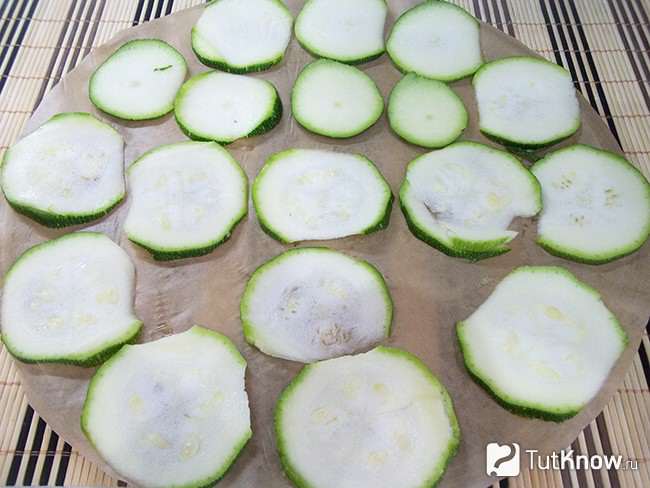 5. Поставте деко в мікрохвильовку, увімкніть потужність 750 кВт і сушіть кабачки близько 10 хвилин. Якщо ви використовуєте духовку, то нагрійте її до 150 градусів і підсушуйте овоч протягом півгодини.