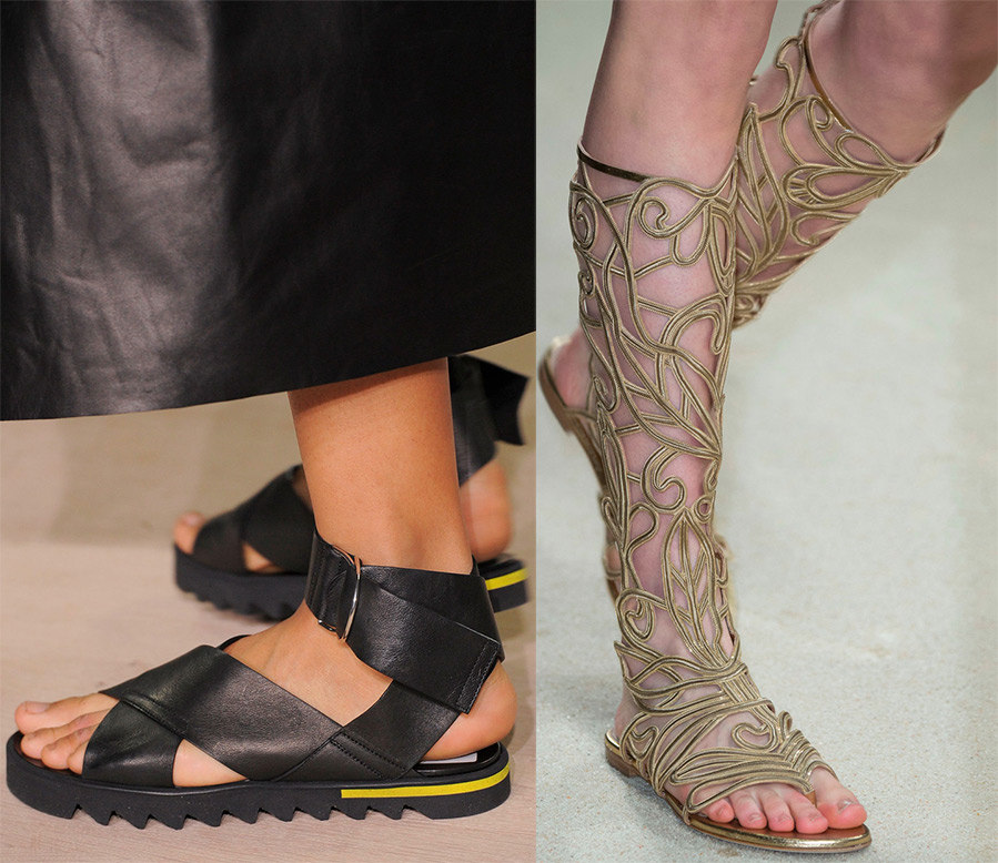 Літнє взуття завжди багато декорована – плетіння, квіти, вишивка, шкіряні ремінці. Тонкі переплетення вже не перший сезон, а переплетення з широкими ремінцями, стрічками та іншими різними видами текстилю набирають популярність. Особливо в тренді стрічки і шнурівка. В якості декору використовують люверси, ланцюжки.