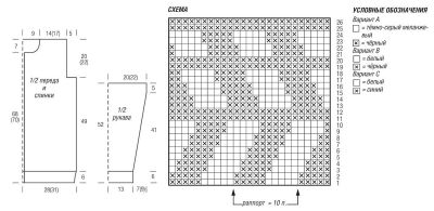 Кром., почати за схемою, 4 рази повторити раппорт, кром. Для скосів рукава набрати з обох сторін від планки в кожному 10-му р. 5 х 1 п. = 57 п. Через 52 р. жакардового візерунка зв’язати чорною ниткою 2 р. ізн. плат, в’язки, в останньому ряду рівномірно набрати 2 п. = 59 п. Потім виконувати візерунок із знятих петель в колірній оследовательности і для скосів рукава набрати з обох сторін у кожному 10-му р. 8 х 1 п. (поперемінно в кожному 6-му і 8-му р. 8 х 1 п., потім в кожному 6-му р. 3 х 1 п.) = 75 (81) п. Через 52 см від початку роботи всі петлі закрити.