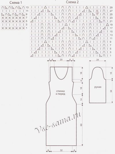 Набрать110 п. і пров’язати гумкою за схемою 1, продовжити в’язання основним візерунком за схемою 2. На висоті 60 см від набірного ряду, для приталивания моделі з обох сторін, в кожному 3-му особовому ряду закрити 12 разів по 1 п. Потім з обох сторін у кожному 12-му особовому ряду додати 4 рази по 1 п. На висоті 92 см від набірного ряду для освіти пройм з обох сторін у кожному особовому ряду закрити 1 раз за 4 1в 1 раз по 2 п, 3 рази по 1 п. На висоті 114 см від набірного ряду петлі закрити.