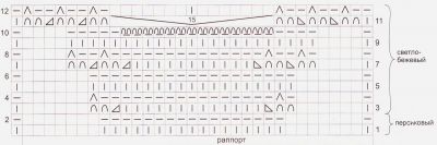 Пряжею світло-бежевого кольору набрати на спиці 111 п. і в’язати 2 см основним візерунком за схемою 1. Потім продовжити в’язання пряжею персикового кольору. Перші 60 рядів в’язати на спицях № 3, решта 60 рядів в’язати на спицях № 4, чергуючи кольору пряжі як зазначено вище. Потім провязать 4 см платочної в’язкою і закрити всі петлі.