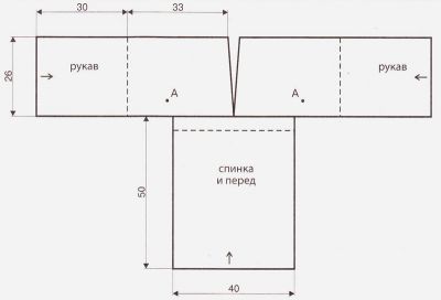 Виконати бокові шви нижній частині туніки. Пришити рукава так, щоб вони утворювали кокетку з V-подібним вирізом горловини переду і шинки (див. викрійку) і зшити їх. Для шнурів виконати гачком з пряжі в два складання ланцюжка з повітряних петель. Довгий шнур протягнути під грудьми по середині гумки 1 на 1 і спереду зав’язувати на бант. Два коротших шнура протягнути на рукавах по лінії, зазначеної на схемі, і з зовнішньої сторони рукавів зав’язувати на бант. До кінців шнурів прикріпити невеликі пензлики. Приблизно в точці А скріпити полотнища рукавів, щоб вони не стовбурчилися.