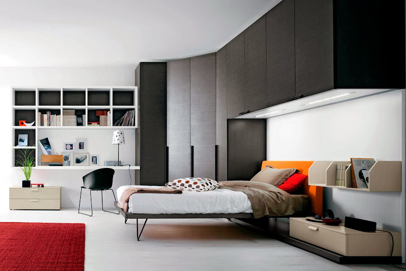 Нескладна конструкція, що складається з полиць з кронштейнами, штанг і висуваються на направляючих, ящиків, допоможе організувати простір невеликої спальні. Рекомендуємо, при цьому, зробити наголос на секції для вішалок, які забезпечать відмінний зовнішній вигляд вашого одягу.