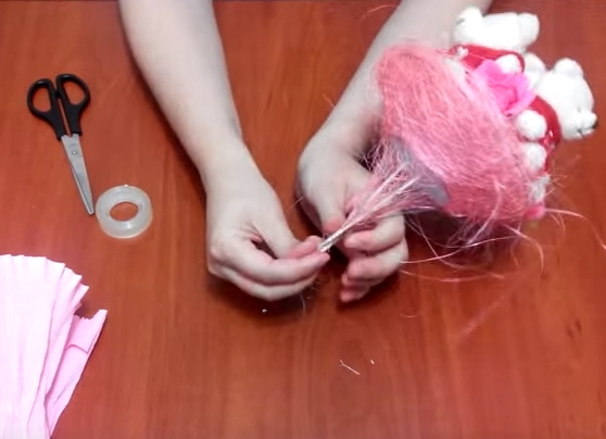 2) м’яких персонажів прив’язуємо стрічками до шпажкам, після чого розміщуємо пухнастиків на основі букета, встромляючи шпажки.