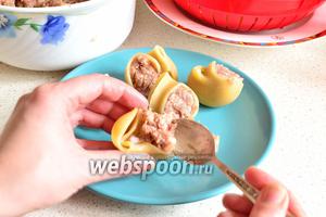 Тепер фаршируємо черепашки фаршем. Кожну мушлю щільно набиваємо м’ясом з допомогою ложки. У процесі приготування фарш трохи стиснеться, тому, не шкодуємо фаршу.