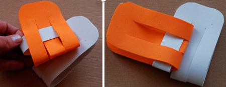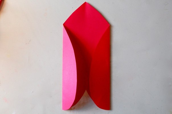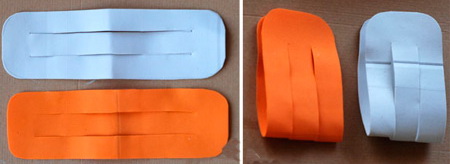 Виріжте два різнокольорових овалу із щільного паперу і зробіть два рівномірних надрізи вздовж заготовки. Згорніть їх навпіл.