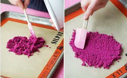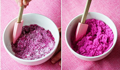 Візьміть чверть склянки цукру, додайте до нього барвник. Все ретельно перемішайте, при необхідності, додайте ще барвника. Повинен вийти насичений колір. Потім у цю суміш додайте одну чайну ложку білка. Добре перемішайте. Консистенція тіста повинна бути як мокрий пісок, не рідка! Інакше, цукор може розчинитися.