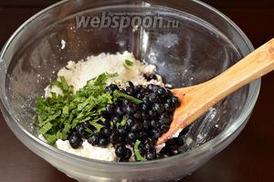 З’єднати підготовлений сир, чисту чорницю, цукор і дрібно нарізану м’яту (листя).