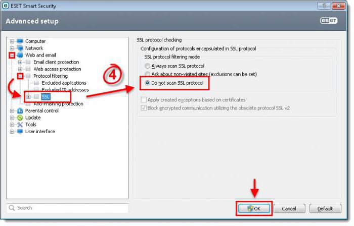 Досить часто зустрічається проблема, що містить у блокуванні SSL-з’єднання антивірусними пакетами. У більшості випадків це властиво пакету Eset Smart Security, починаючи з п’ятої версії.