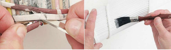 Беремо газетну сторінку і розгортаємо, нарізаючи її на чотири частини. Далі беремо паличку для шашликів і починаємо накручувати на неї смужки газет.