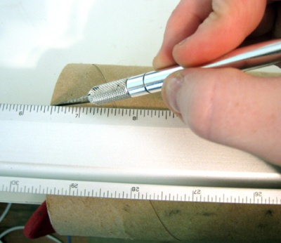 Необхідно взяти втулку і розрізати її наполовину, визначивши лінійкою центр.