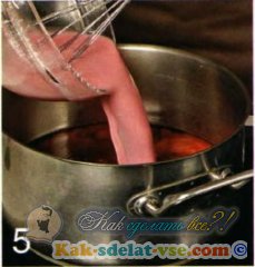 9.Суміш борошна і соку тонкою цівкою вливаємо в загустілий виноградний сік, також помішуючи. Тушкуємо на слабкому вогні ще 5-7 хвилин. Отриманий сироп повинен вийти густим, солодким і тягучим, як карамель, інакше правильно приготувати страву не вийде.