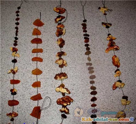 4.Починаємо нанизувати горіхи. Вони можуть бути різних розмірів – цільні, розламані навпіл або на чверть. Головне, мати на увазі – якщо сильно подрібнити, то вони можуть не нанизаться – будуть ламатися і кришитися.