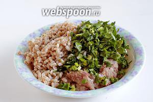 Додати до фаршу січену зелень (хто яку любить), відварену перловку, запашний перець, посолити за смаком і добре перемішати до однорідності.