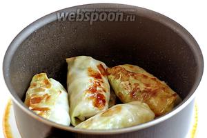 Скласти обсмажені голубці в приготований соус, додати лавровий лист і тушкувати до готовності і м’якості капусти.