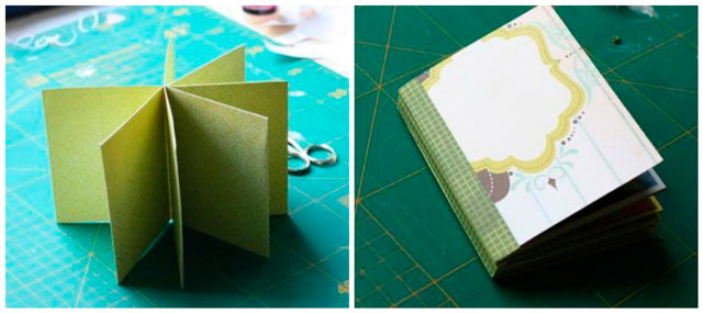 Використовуйте штампи, фігурні ножиці, шматочки тканини та ниток, гудзики і стрази — все, що вам захочеться. Тільки не забувайте про те, що велика кількість об’ємних елементів для маленького альбому не підходить. Зовнішній вигляд виробу в закритому вигляді також дуже важливий.