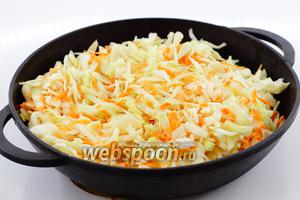Моркву натріть на крупній тертці. Капусту нашаткуйте невеликою соломкою. Перемішайте. Додайте до смаженій луку. Готуйте до м’якості овочів. Я, звичайно, роблю це дуже швидко. Обсмажую на сильному вогні, постійно помішуючи.