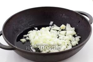 А поки готуємо начинку. Цибулю наріжте невеликими шматочками. Обсмажте на олії до м’якості.