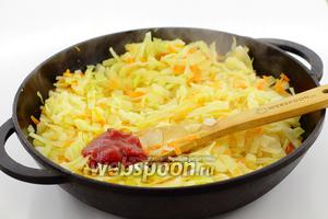 Додайте томатну пасту. Перемішайте. Готуйте ще 5-10 хвилин. Посоліть, поперчіть, за бажанням, додайте мелений кмин. Остудіть до кімнатної температури.
