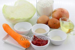 Капуста білокачанна 500 гЦибуля ріпчаста 100 гОлія соняшникова рафінована 30 млМорква 100 гПерець чорний мелений 2 щіпкиСіль 2 щіпкиКмин мелений 1 щіпкаТоматна паста – 70 г