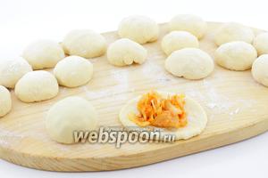 Розкачайте в пласт, нетонкий. У центр додайте 1 ложку начинки. Підніміть краї і добре защипайте. Сформуйте кулю.