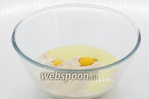 Додайте сіль, олію, курячі яйця. Перемішайте.