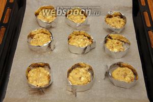 Викладаємо тісто на пергамент. Я роблю формочки з фольги, щоб тісто не сильно розтікалося і печиво було приблизно одного розміру. Можна і без них, тоді печива повинні бути на відстані 3-4 см один від одного.