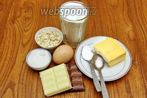 Для приготування нам знадобиться маргарин, сіль, цукор, борошно, яйце, розпушувач, вівсянка, білий шоколад, молочний шоколад.