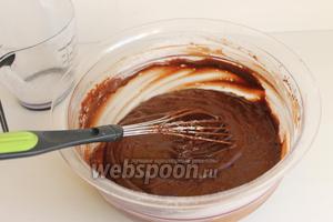 Розтопити шоколад з маслом в мікрохвильовці. Дамо охолонути. Додамо яйця, цукор, молоко, какао.