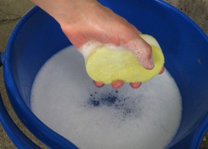 • додати рідина для миття посуду або порошок для прання і змочити в цьому розчині губку для миття;