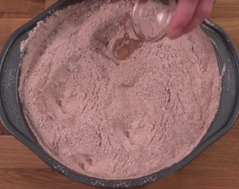 • У невеликій чашці розмішай оцет, ванільну есенцію і рослинне масло, додай до сухої суміші. Потім налий склянку води у масу, зроби її однорідною.