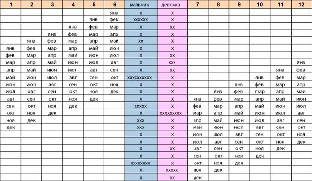 В лівій колонці вказано вік від 18 до 45 років, а в решті частини таблиці — дванадцять місяців з вірогідним підлогою малюка.