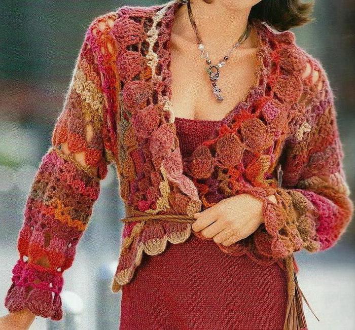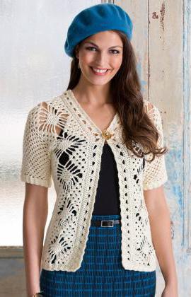 В залежності від довжини і матеріалу, з якого зроблена модель, вона буде виглядати зовсім по-різному. Жакетик без рукавів, наприклад, підходить до шортах і джинсів. Ажурний жакет гачком, схема і опис якого повністю збігаються з описом мотиву “бабусин квадрат”, виконується з товстої нитки і добре замінить звичну вітровку в прохолодну пору року.