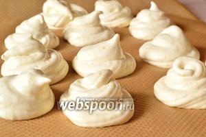 Тепер діємо швидко. Завантажуємо зефірну масу в кондитерський мішок. Мішок краще підготувати заздалегідь, щоб він вже був під рукою. І відсаджуємо зефірки на папір для випічки або силіконовий килимок. Залишаємо сохнути і стабілізуватися на 24 години.