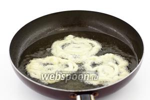 Тісто додайте в кондитерський мішок з маленьким отвором. У сковороді розжарте соняшникову олію. Тісто отсадите швидко у вигляді спіральок. Тут уже подивіться, як у вас вийде. Обсмажте на помірному вогні, з 2 сторін до золотистого кольору. Готові спіральки викладіть на паперовий рушник, щоб видалити зайве масло.