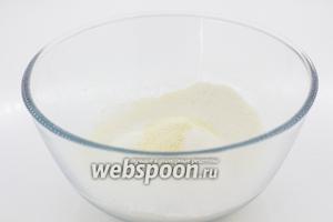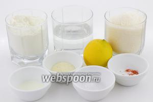 Візьміть такі продукти: борошно пшеничне, соду, кефір, манну крупу, воду, цукор, лимонний сік, шафран, олія соняшникова.