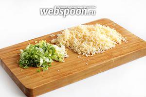Сир натерти на дрібній тертці, часник і листя салату дрібно нарізати.