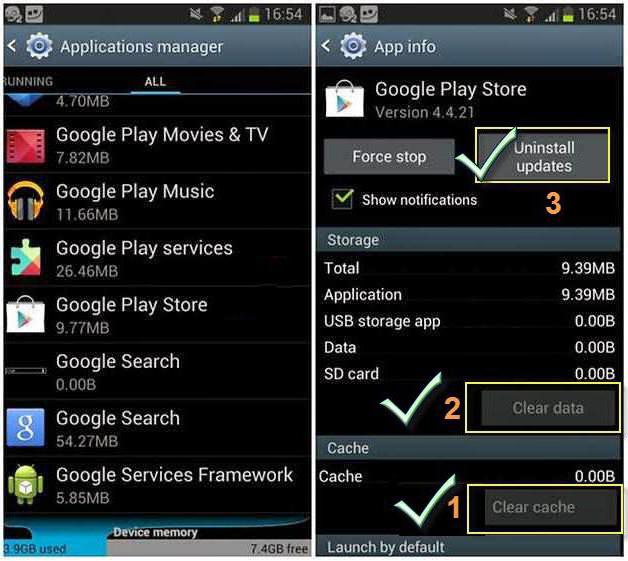 Втім, раз всі помилки мають однакову природу, то і методика їх виправлення практично для всіх випадків залишається однаковою і зводиться всього лише до трьох речей: очищення кеша даних і програми, видалення апдейтів самого сервісу і коректному введенню облікового запису. Само собою зрозуміло, що помилка Google Play Market може бути пов’язана з порушенням працездатності знімного носія, але про це буде сказано трохи пізніше. А поки зупинимося на найбільш простих рішеннях.