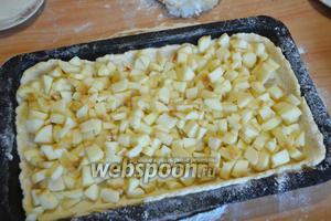 Посипати манкою, далі яблука, верхи присипати червоною желе. Якщо у вас яблука кислі, то за бажанням можна посипати ще трохи цукром.