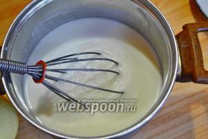 Борошно розмішати з цукром, влити 1/2 частину молока і ретельно вимішати, щоб не було грудочок. Влити решту молока, поставити на невеликий вогонь і варити, постійно помішуючи до загустіння.