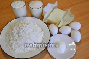 Для тіста взяти сметану, цукор, маргарин, яйця, борошно і порошок для випічки.