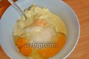 Борошно просіяти з порошком для випічки, додати яйця, розтоплений маргарин, сметану з цукром.