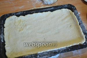 Змастити форму олією і включити духовку на 200°С. Тісто розділити на 4 рівні частини, кожну розкачати за розміром форми. У мене форма розміром 20х30 см. Вистелити 1 пласт тіста, проколоти виделкою.