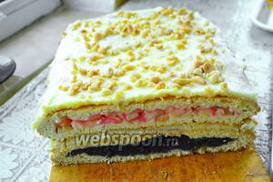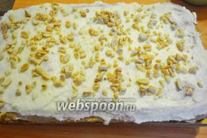 Збираємо пляцок. Першим викласти корж з маковою начинкою, змастити 2/3 крему, накрити другим коржем з яблучною начинкою, змастити залишилися кремом і посипати арахісом.